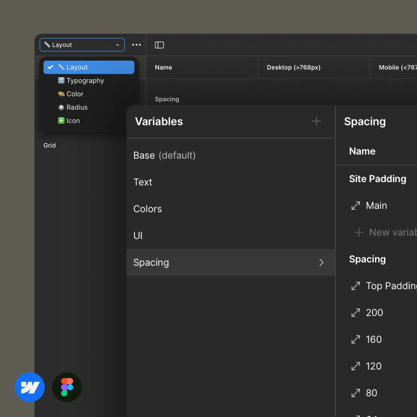 Colors, fonts, and spacing linked between Figma and Webflow — easy to adjust to your brand, like swapping out siding colors.